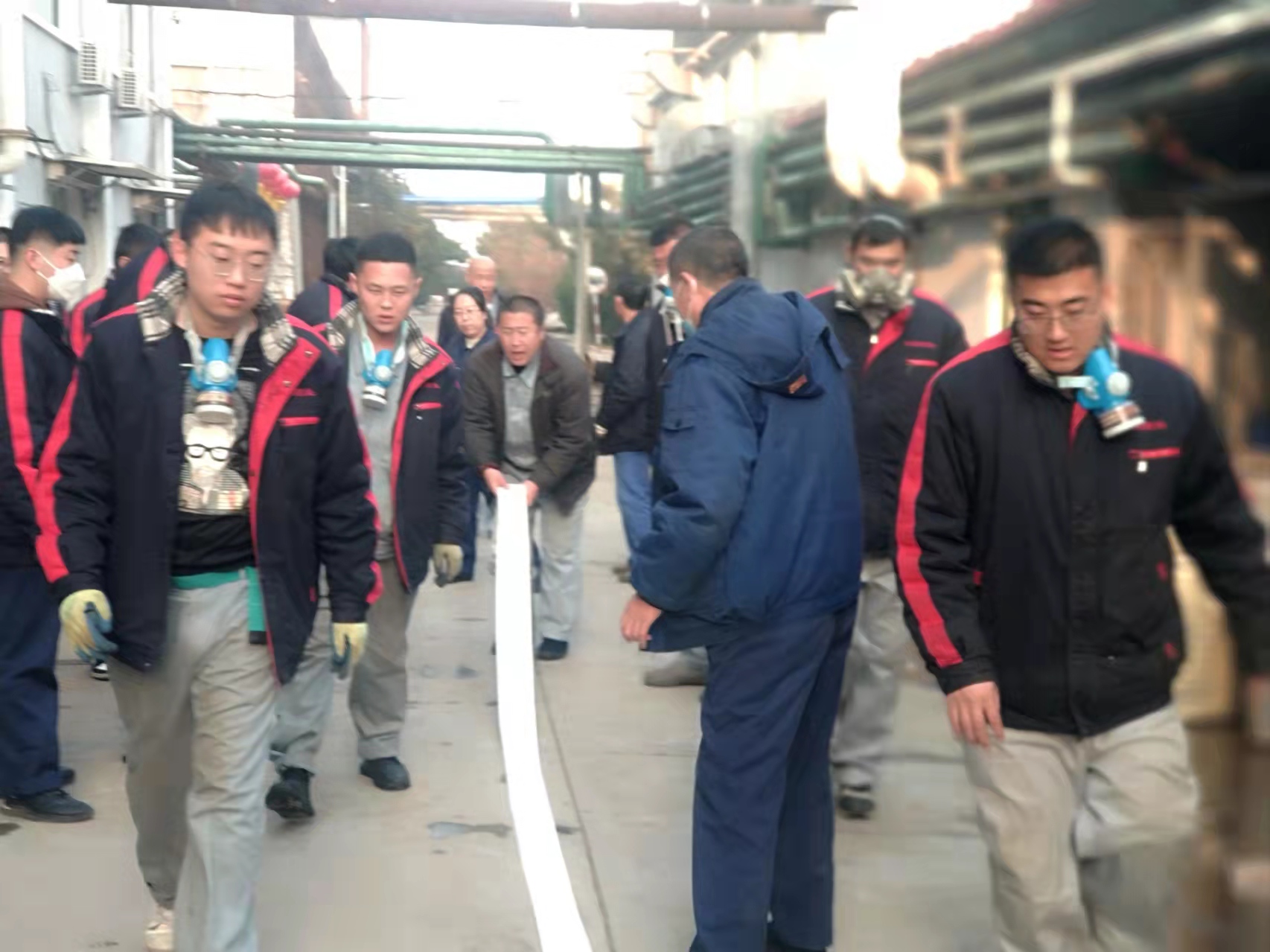 演練模擬原料車(chē)間合成一室發(fā)生火災(zāi)爆炸,車(chē)間立即啟動(dòng)應(yīng)急預(yù)案,進(jìn)行實(shí)際演練。